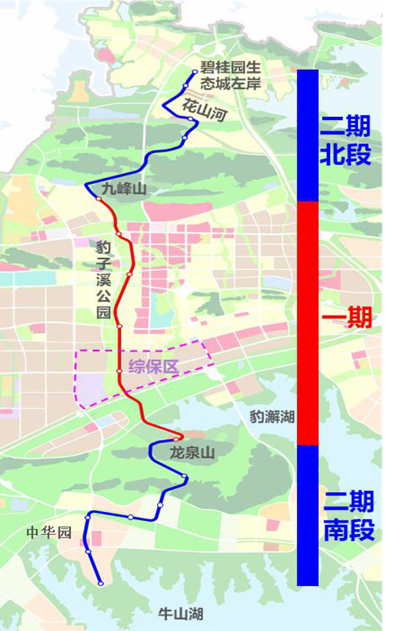 光谷空轨沿生态大走廊南北向直线布设,起于花山碧桂园生态城左岸,经由花山河、九峰山、光谷中心城、综保区、龙泉山、中华园,止于牛山湖环湖湾区,线路全长约26.7公里,设站16处,配套车辆段与停车场各1处。