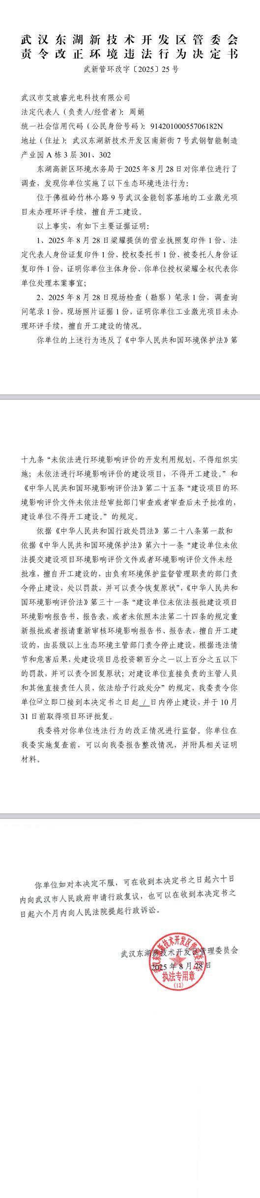 武汉市艾玻睿光电科技有限公司责令改正环境违法行为决定书