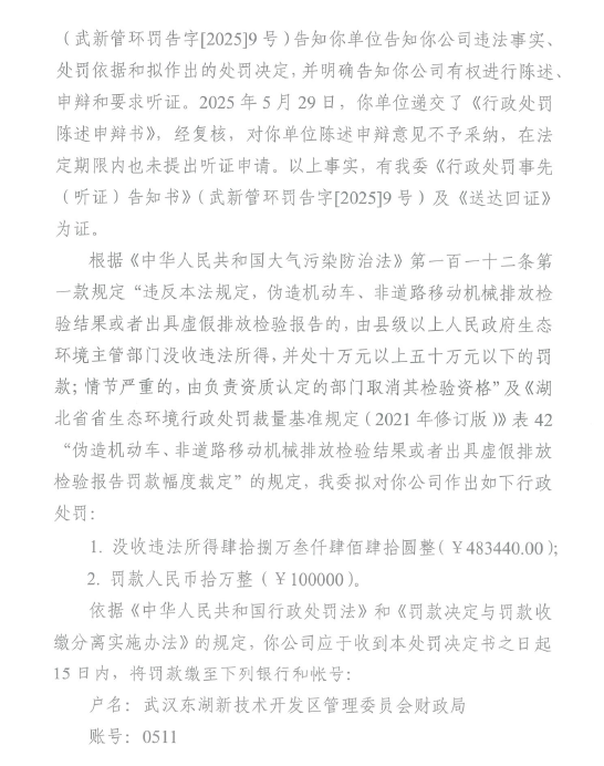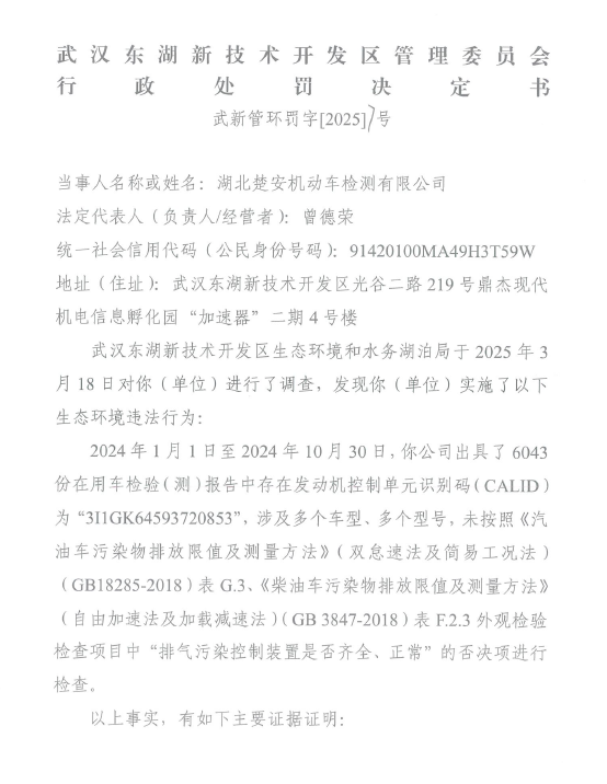 行政处罚决定书(湖北楚安机动车检测有限公司)