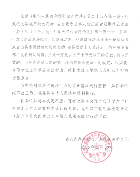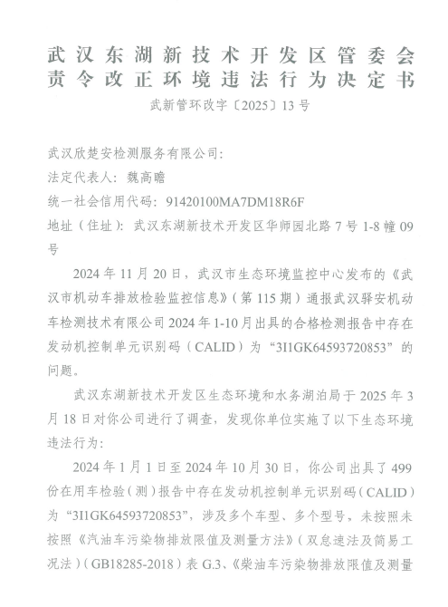 责令改正违法行为决定书(武汉欣楚安检测服务有限公司)