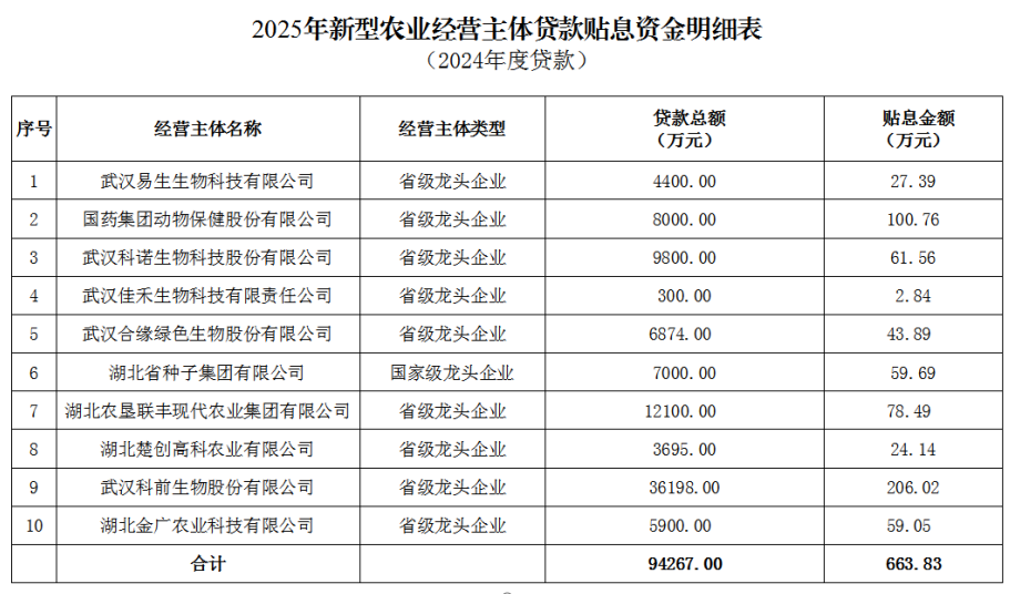根据《省财政厅省农业农村厅关于印发<湖北省新型农业经营主体贷款贴息实施办法>的通知》(鄂财农发[2021]18号)和《省农业农村厅省财政厅关于做好2025年新型农业经营主体贷款贴息工作的通知》(鄂农函[2025]42号)等文件要求,我区省级及以上农业龙头企业通过“湖北省新型农业经营主体管理平台”自主申报,经区、市、省逐级审核,贴息资金663.83万元。