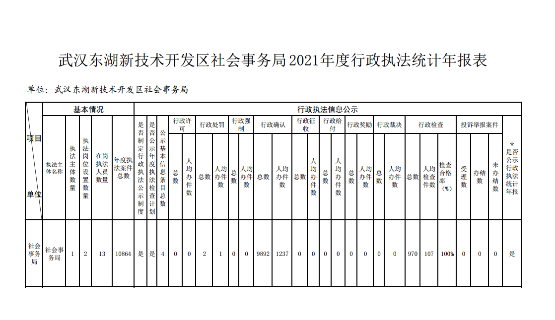 武汉东湖新技术开发区社会事务局2021年度行政执法统计年报表