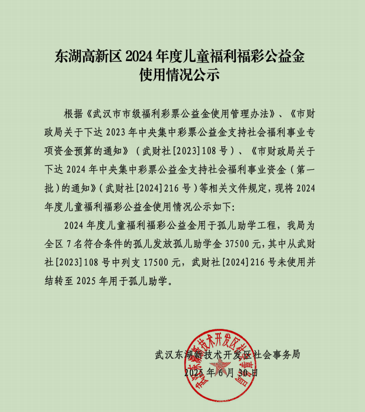 东湖高新区2024年度儿童福利福彩公益金使用情况公示