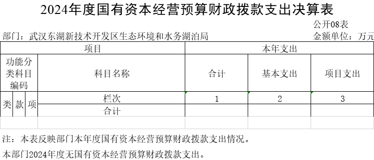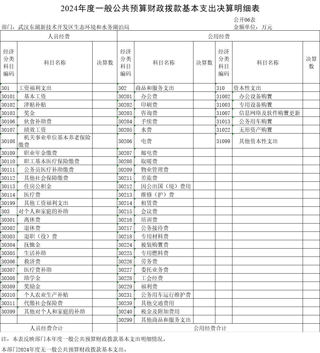 武汉东湖新技术开发区生态环境和水务湖泊局,人员经费及公用费用全部从东湖高新区管委会预算中列支,因此,2024年一般公共预算财政拨款基本支出决算数为0万元,本部门支出全部为项目支出。