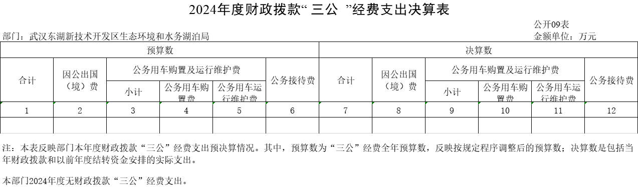 武汉东湖新技术开发区生态环境和水务湖泊局上报经费差额表,“三公”经费全部从东湖高新区管委会预算中列支,因此,2024年一般公共预算财政拨款“三公”经费支出决算数为0万元。