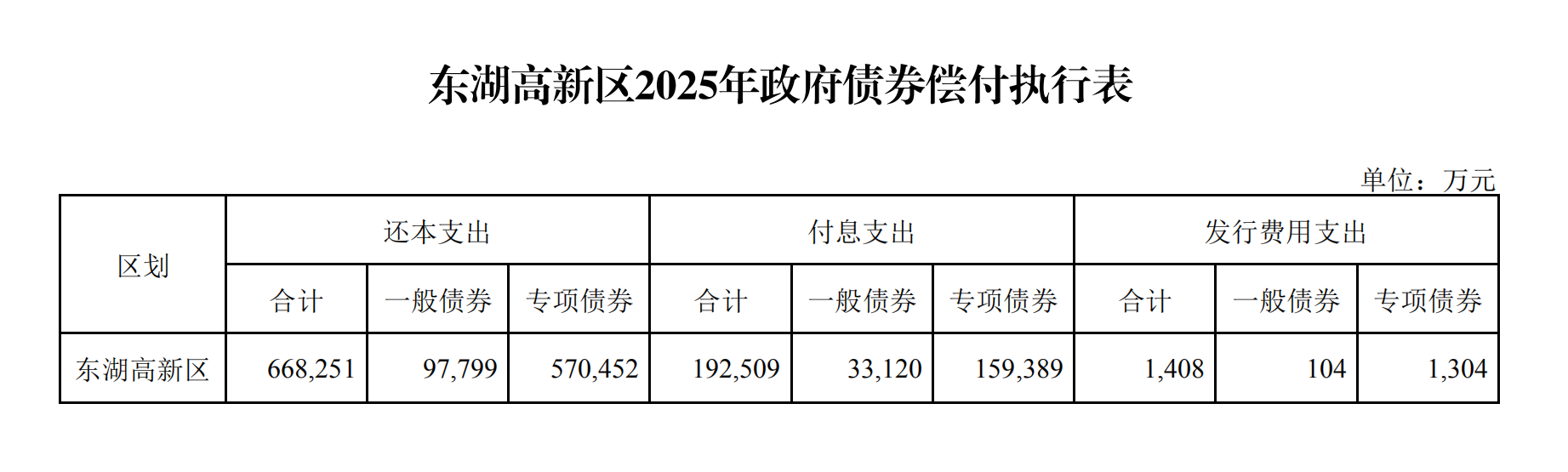 东湖高新区2025年政府债券偿付执行表
