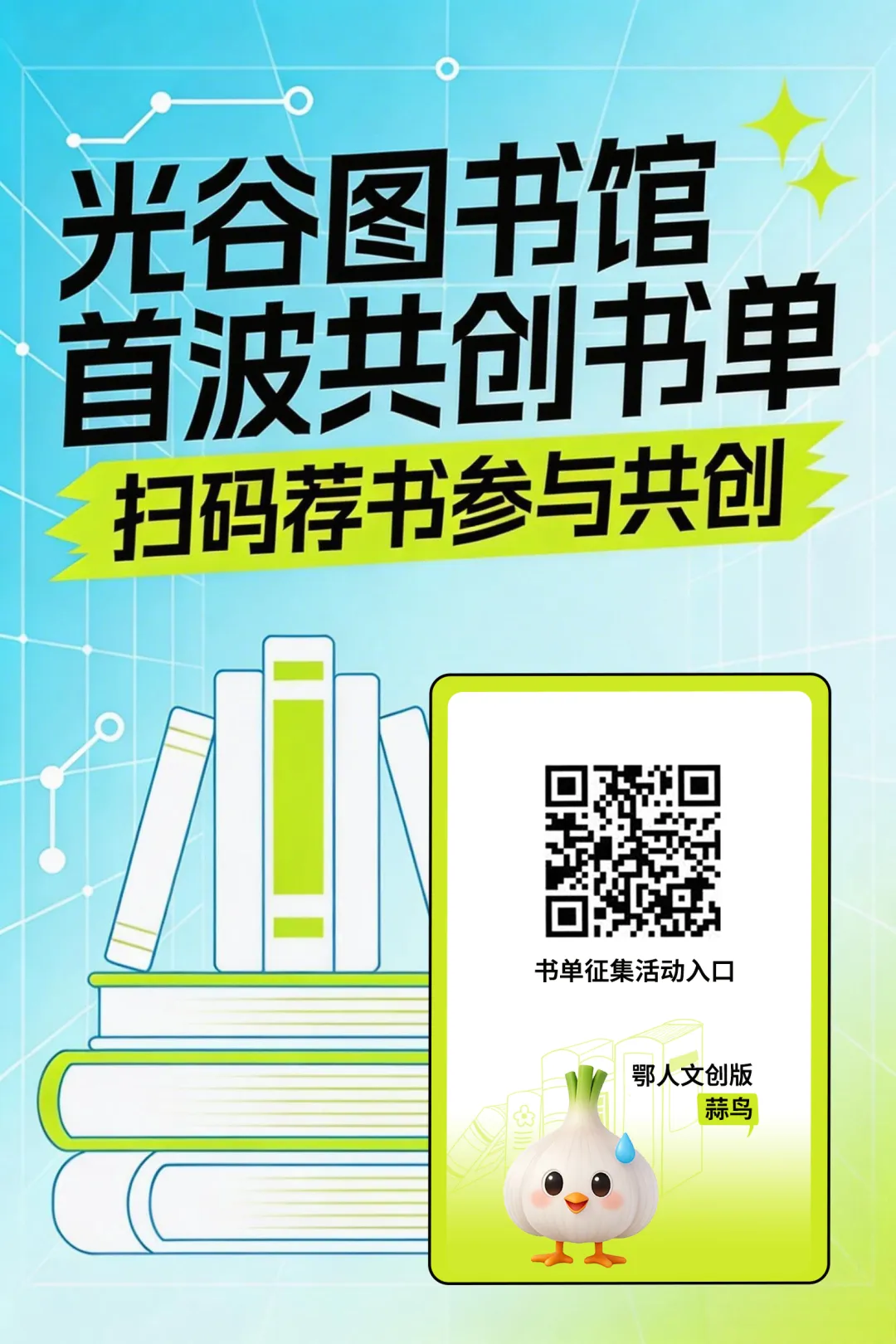 即日起至2026年4月12日,光谷图书馆首波书单征集活动开启!成功荐书,还有机会抱走鄂人文创正版“蒜鸟”,快来参与吧!