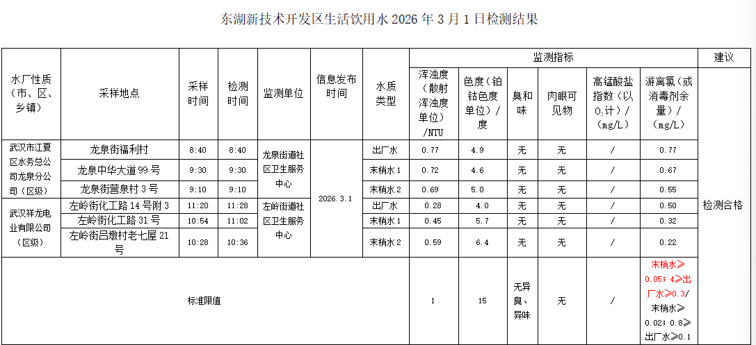 东湖新技术开发区卫健局水质日监测公示