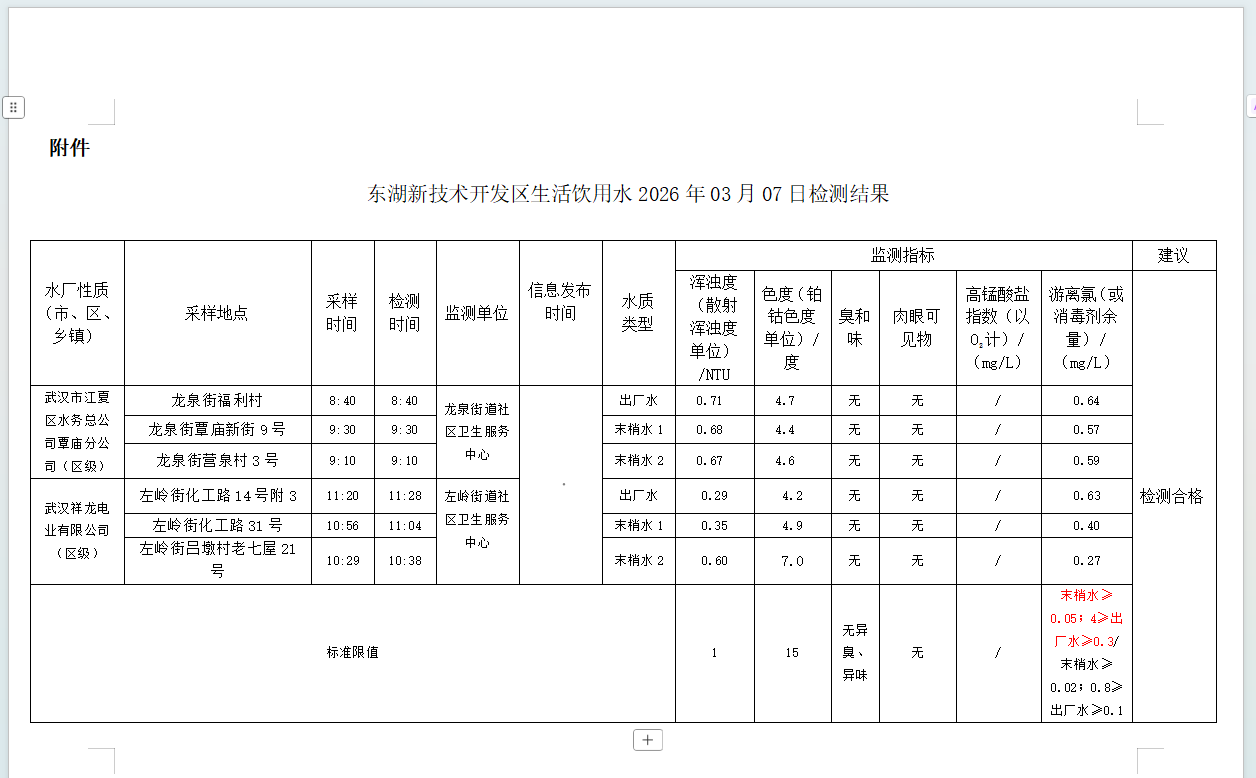 东湖新技术开发区卫健局水质日监测公示