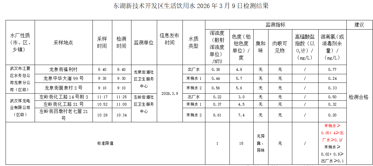 东湖新技术开发区卫健局水质日监测公示