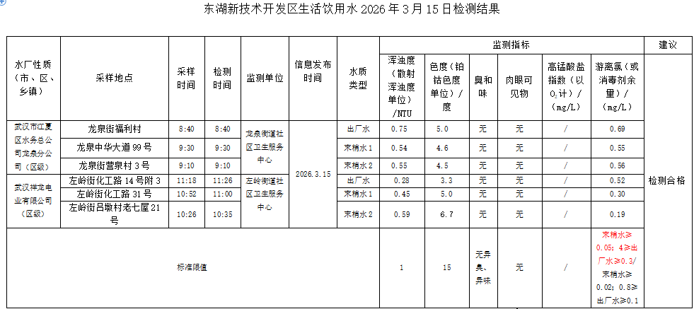 东湖新技术开发区卫健局水质日监测公示