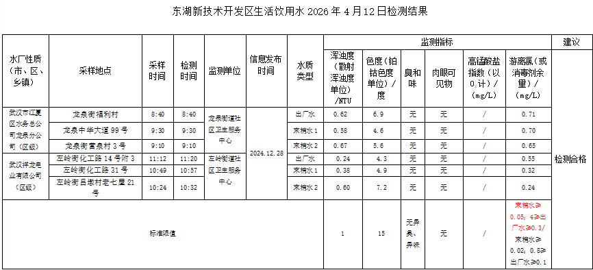 东湖新技术开发区卫健局水质日监测公示