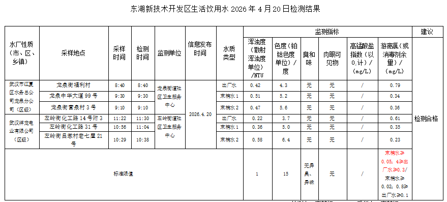东湖新技术开发区卫健局水质日监测公示