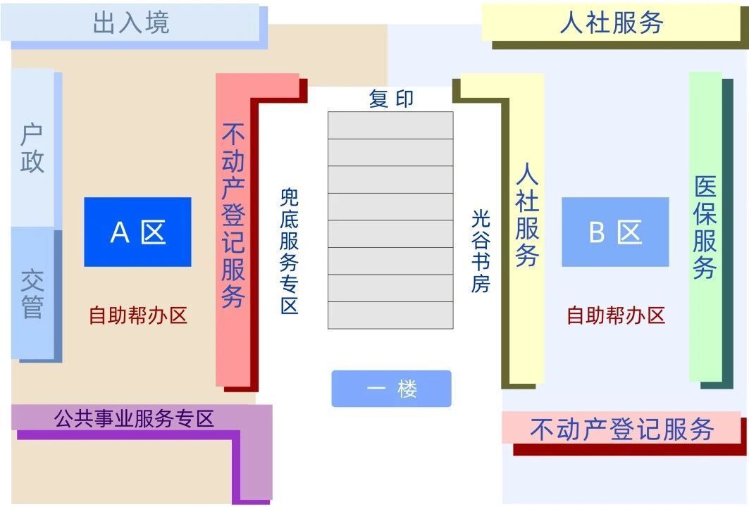 ◆ A区:不动产登记、公安服务(户政、出入境、交管)