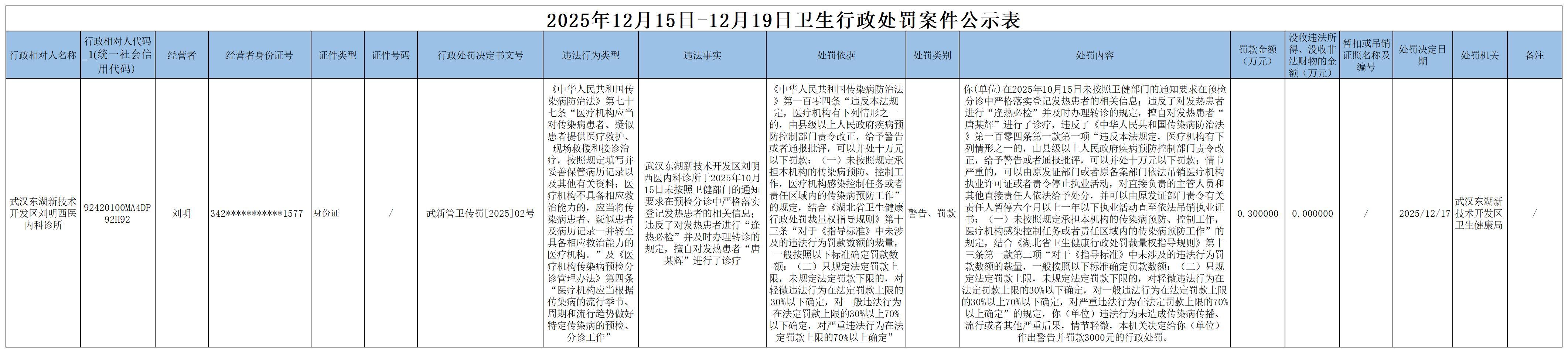 2025年12月15日-12月19日卫生行政处罚案件公示表