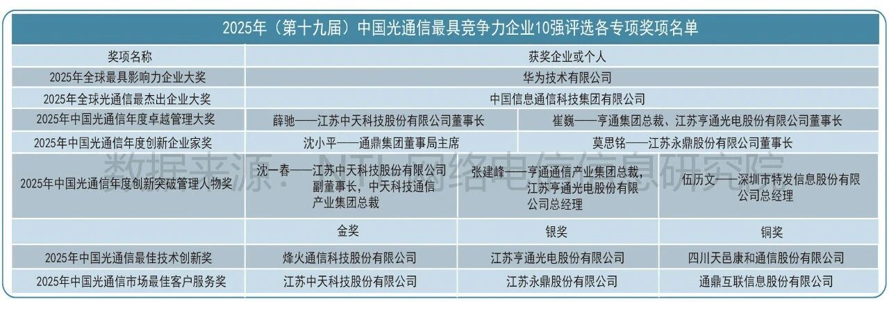 具体来看,中国信科获评“中国光通信最具综合竞争力企业10强”和“中国光通信市场最具品牌竞争力企业10强”,并斩获“2025年全球光通信最杰出企业大奖”;烽火通信在光纤光缆、光传输与网络接入设备等领域同时斩获全球及中国10强,还荣获“2025年中国光通信最佳技术创新奖”;长飞光纤位列“全球光纤光缆最具竞争力企业”第二,并夺得中国区该领域榜首;光迅科技位居“中国光器件与辅助设备最具竞争力企业”第一,并入选“全球光器件最具竞争力企业10强”;华工正源也再度入选“全球光器件最具竞争力企业10强”与“中国光器件与辅助设备最具竞争力企业10强”双榜单。